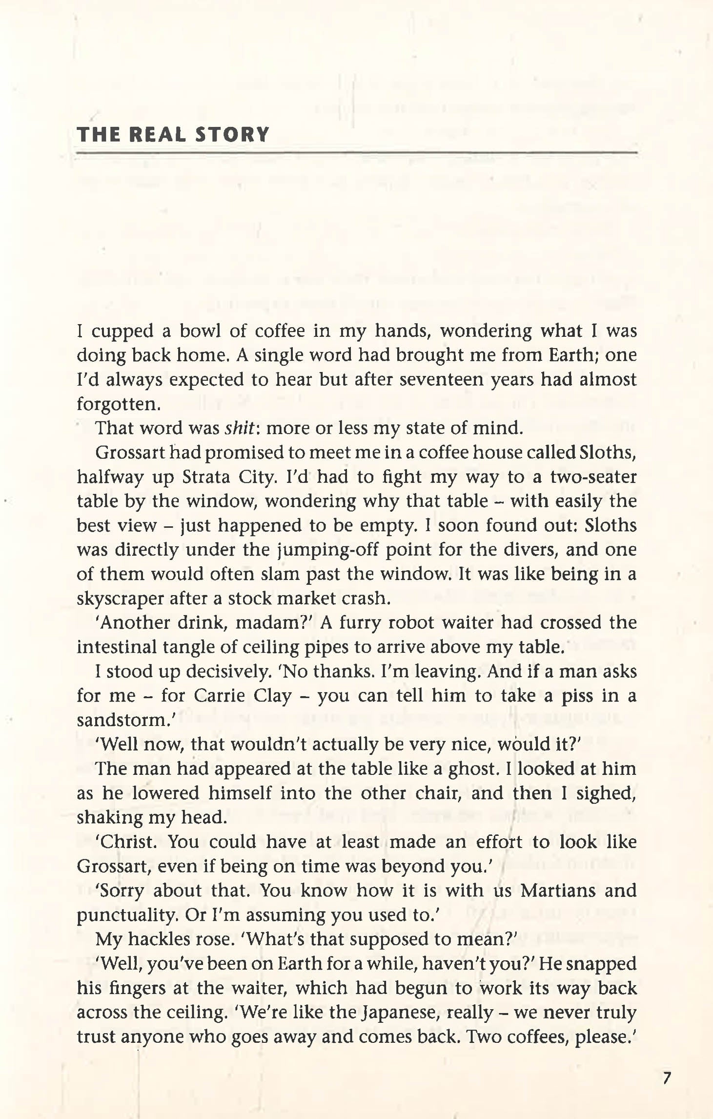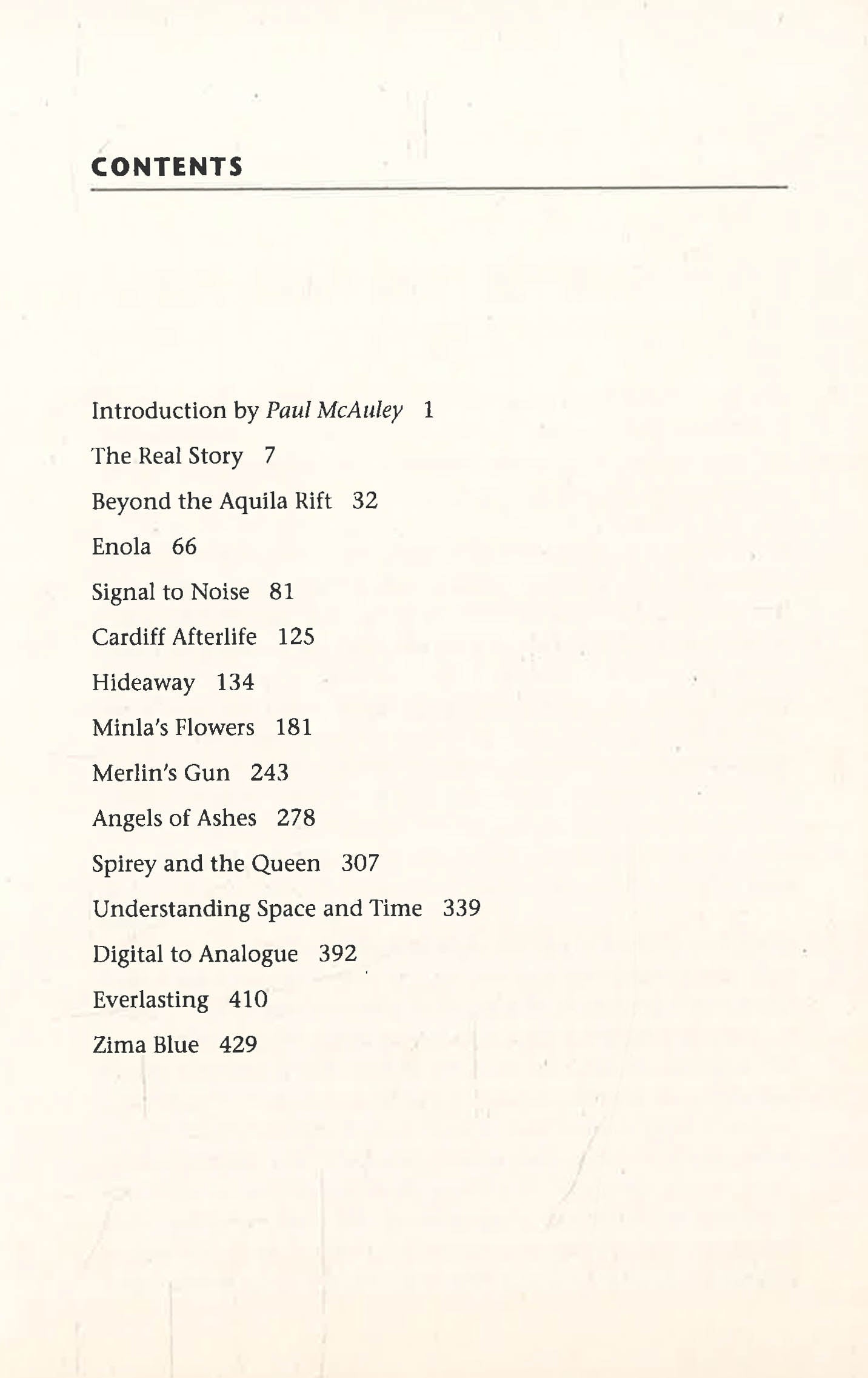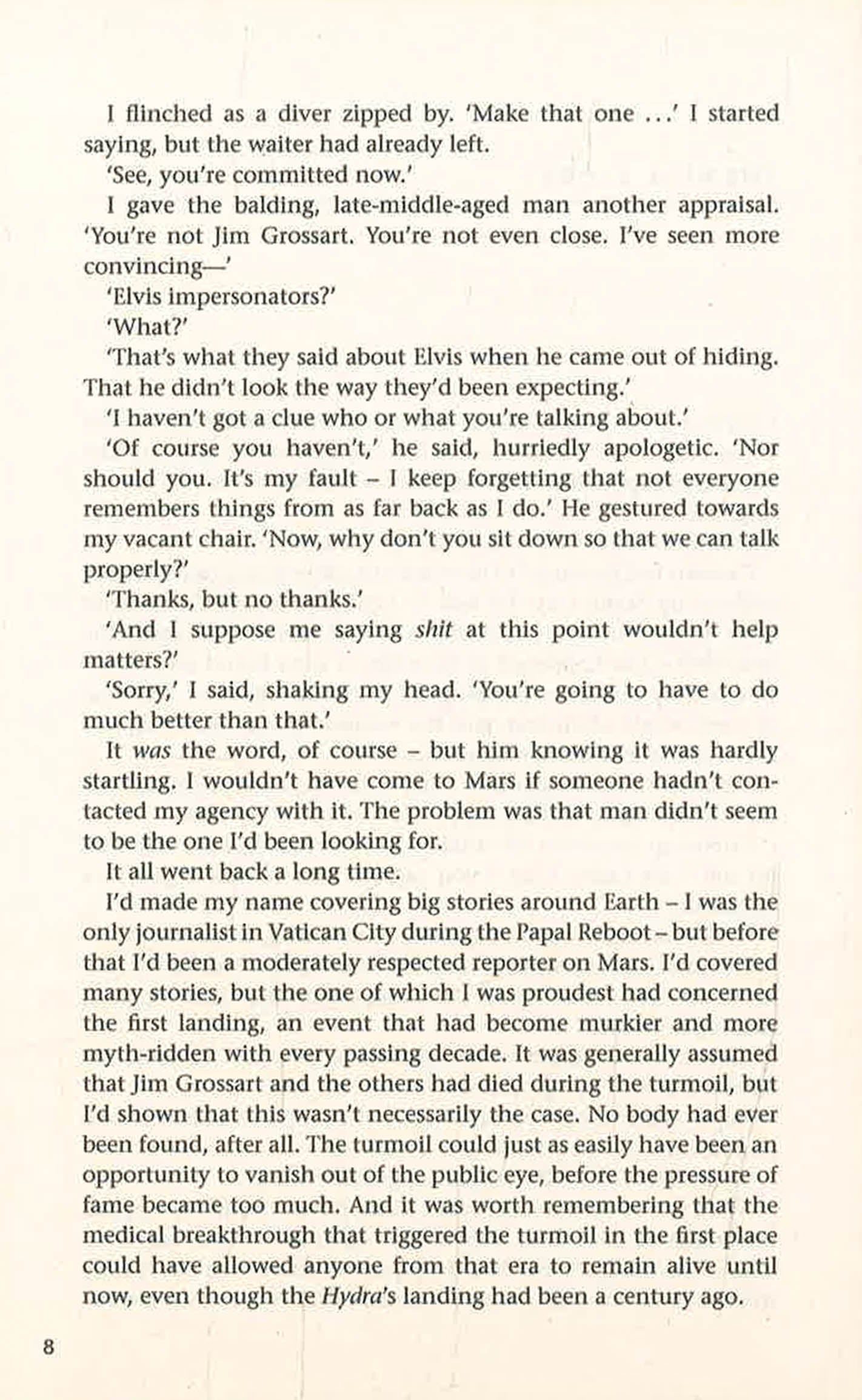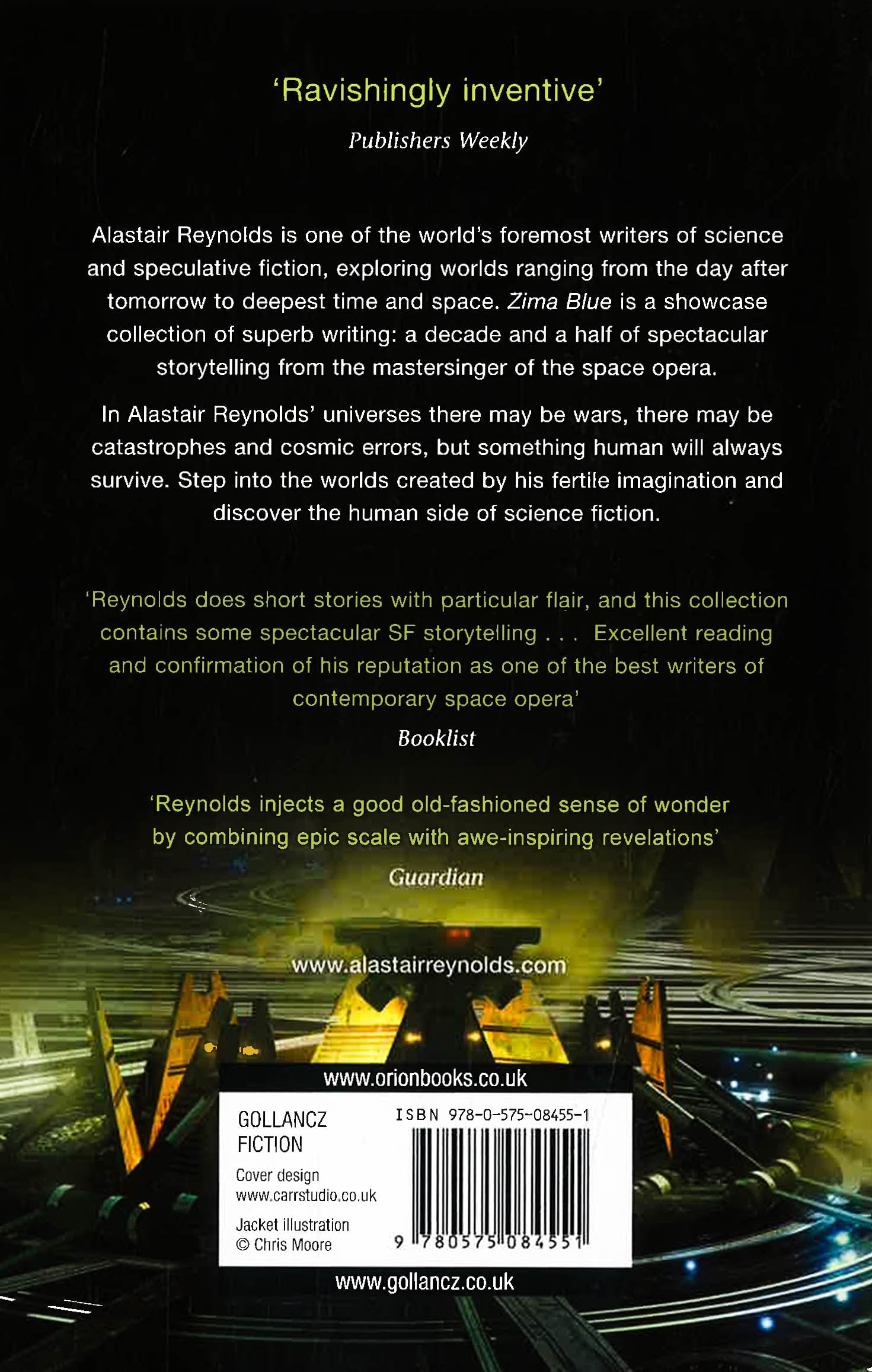 Reynolds' pursuit of truth is not limited to wide-angle star smashing - not that stars don't get pulverised when one character is gifted (or cursed) with an awful weapon by the legendary Merlin. Reynolds' protagonists find themselves in situations of betrayal, whether by a loved one's accidental death, as in 'Signal to Noise', or by a trusted wartime authority, in 'Spirey and the Queen'. His fertile imagination can resurrect Elton John on Mars in 'Understanding Space and Time' or make prophets of the human condition out of pool-cleaning robots in the title story.