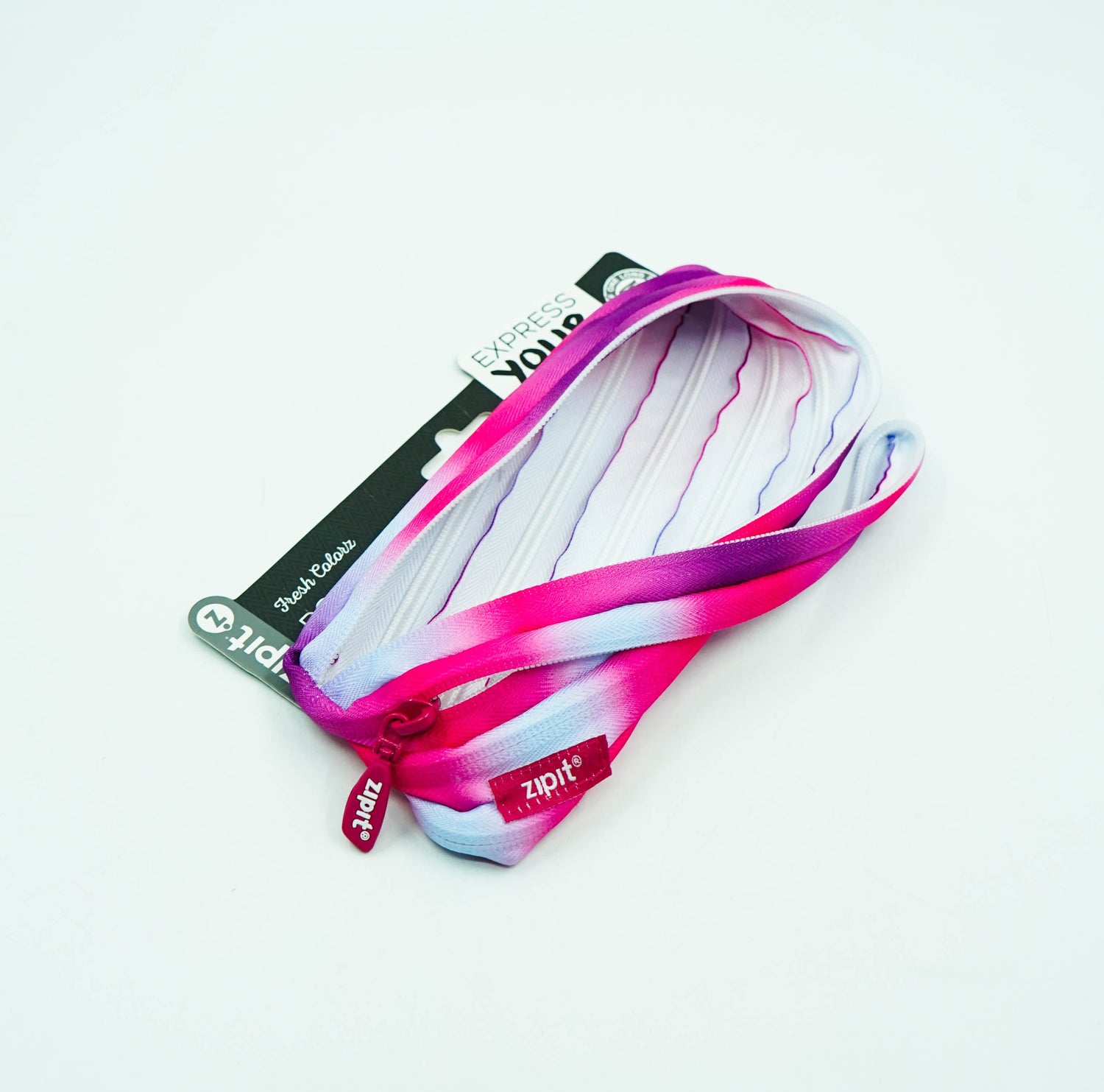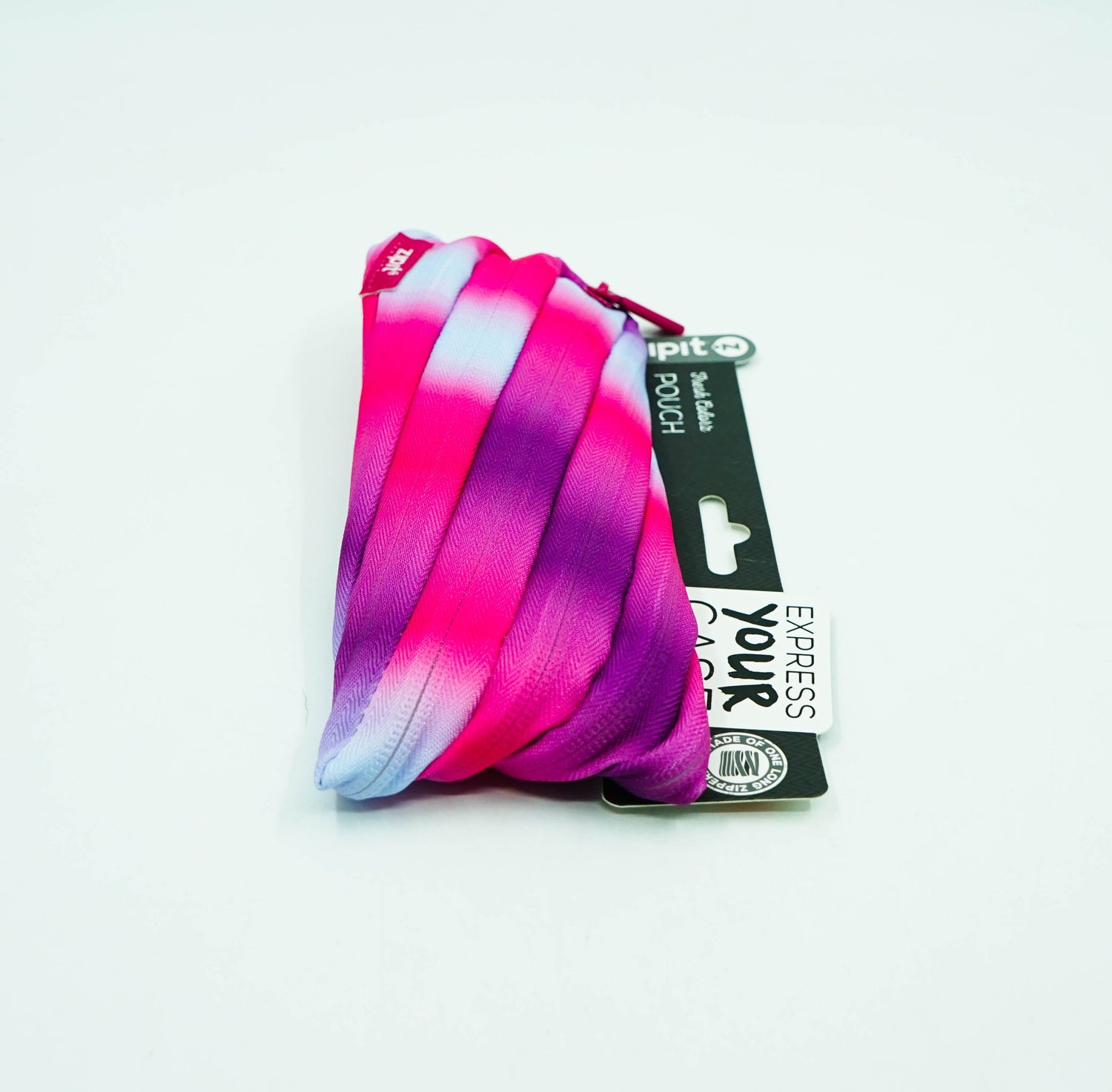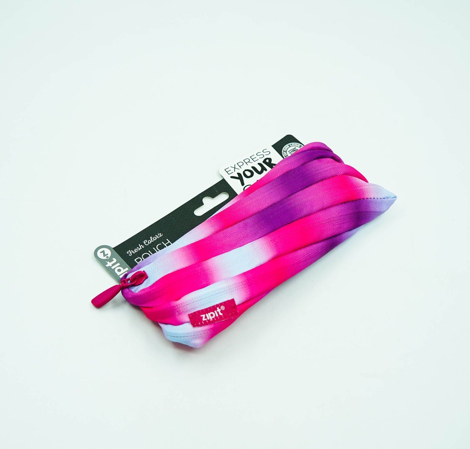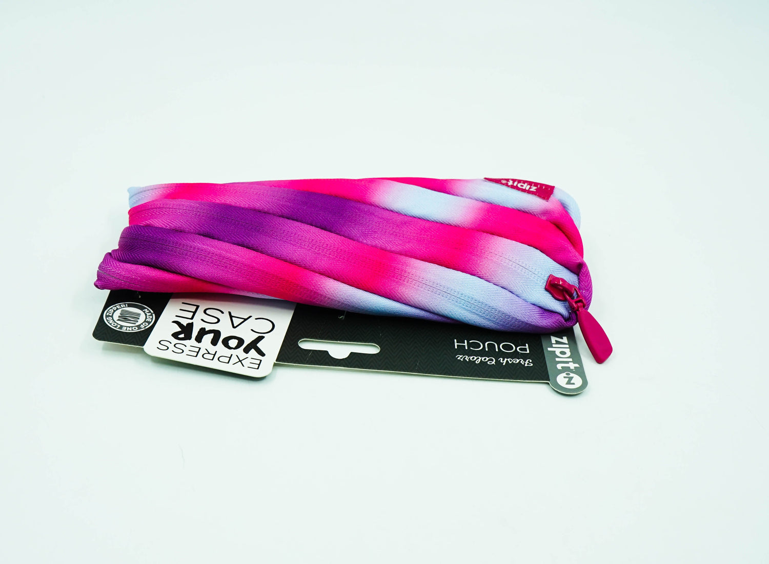 A vibrant fresh colourz print takes center stage on this fun pouch that is equally at home storing pens and pencils, as it is holding makeup. The innovative design features one long zipper concealed by a special sewing technique. It comes with an extra wide diagonal opening and unique rubber zipper pull.