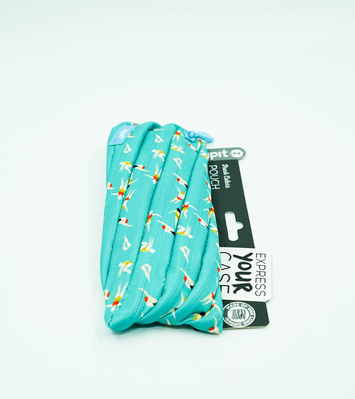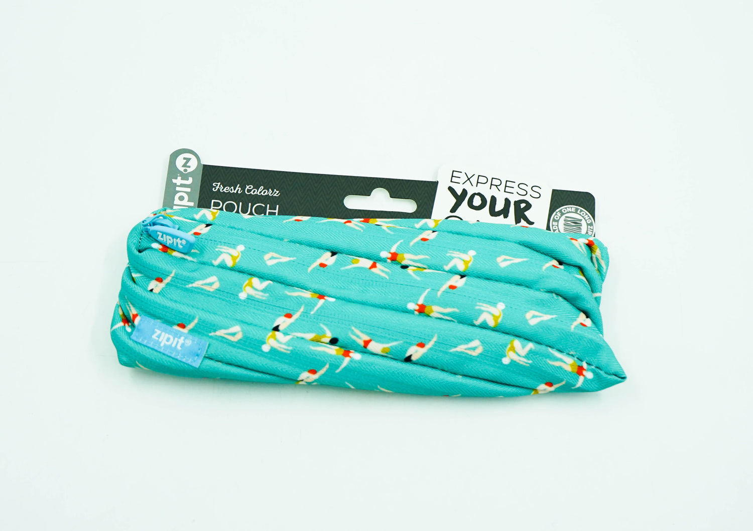 A vibrant fresh colourz print takes center stage on this fun pouch that is equally at home storing pens and pencils, as it is holding makeup. The innovative design features one long zipper concealed by a special sewing technique. It comes with an extra wide diagonal opening and unique rubber zipper pull.