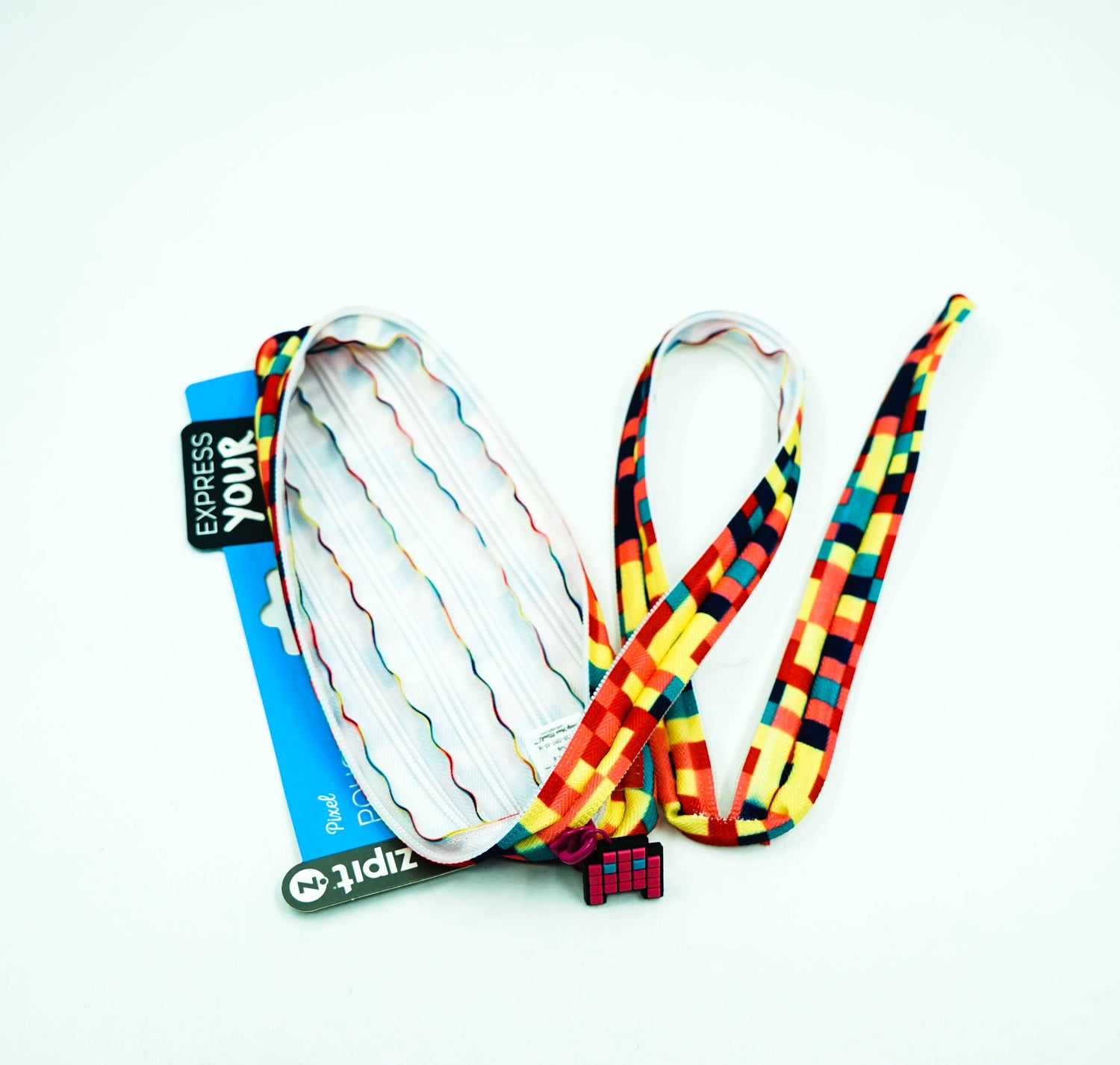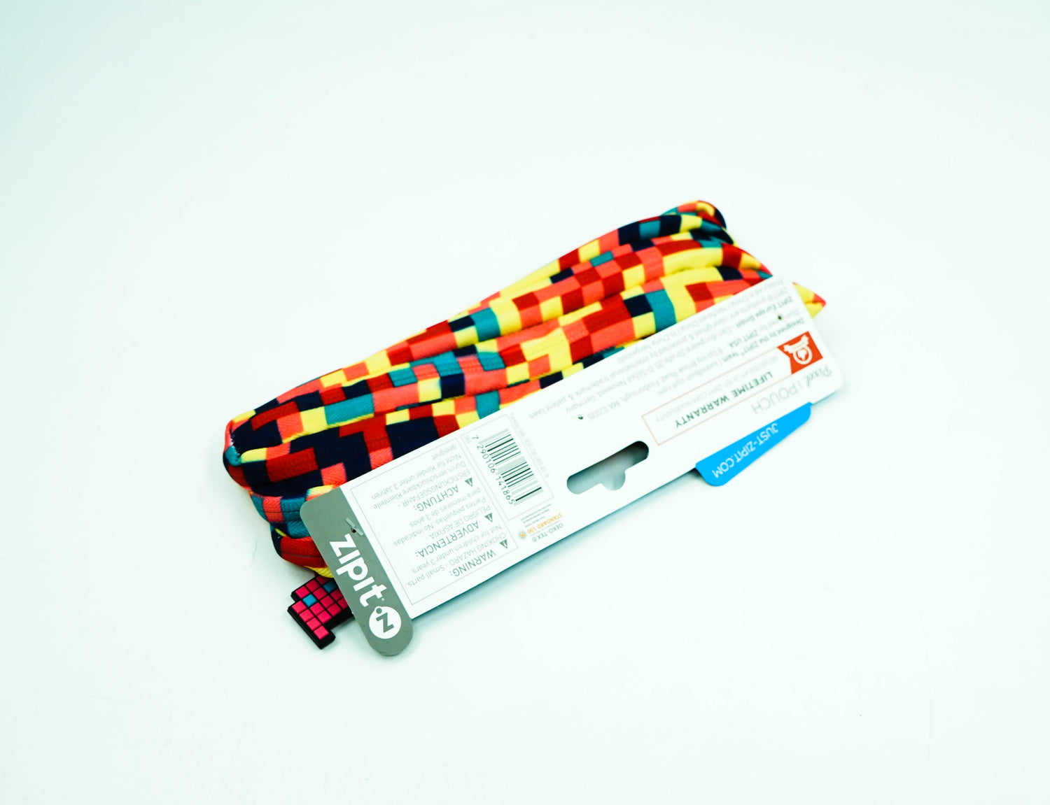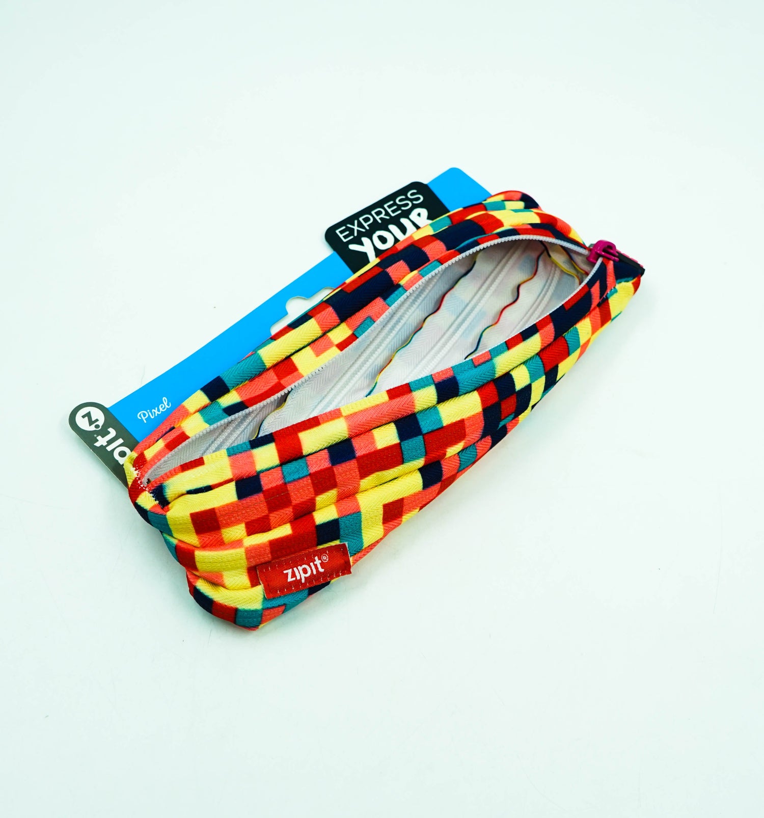 A vibrant pixel-inspired print takes center stage on this fun pouch that is equally at home storing pens and pencils, as it is holding makeup. The innovative design features one long zipper concealed by a special sewing technique. It comes with an extra wide diagonal opening and unique rubber zipper pull. A washable, 100% polyester construction means this pouch is up to any task. You can count on this colorful pouch day in and day out. Use it to hold: Up to 30 pens and pencils Cosmetics and other personal items Cell phone and cell phone accessories Money and more Modern and Versatile This pencil case stands out with its kaleidoscope of colors in a hip, pixelated pattern with matching rubber zipper pull. It’s a fun way to switch up your storage and provides a convenient way to carry a variety of items.