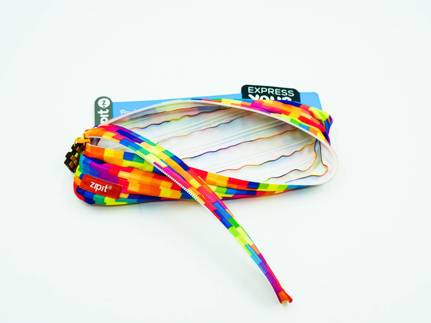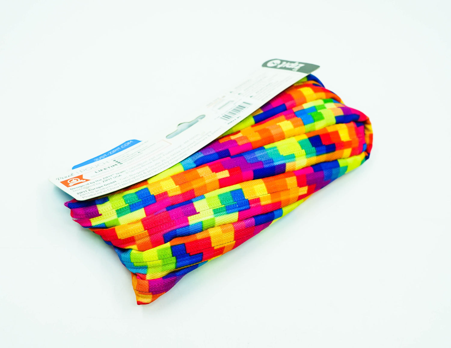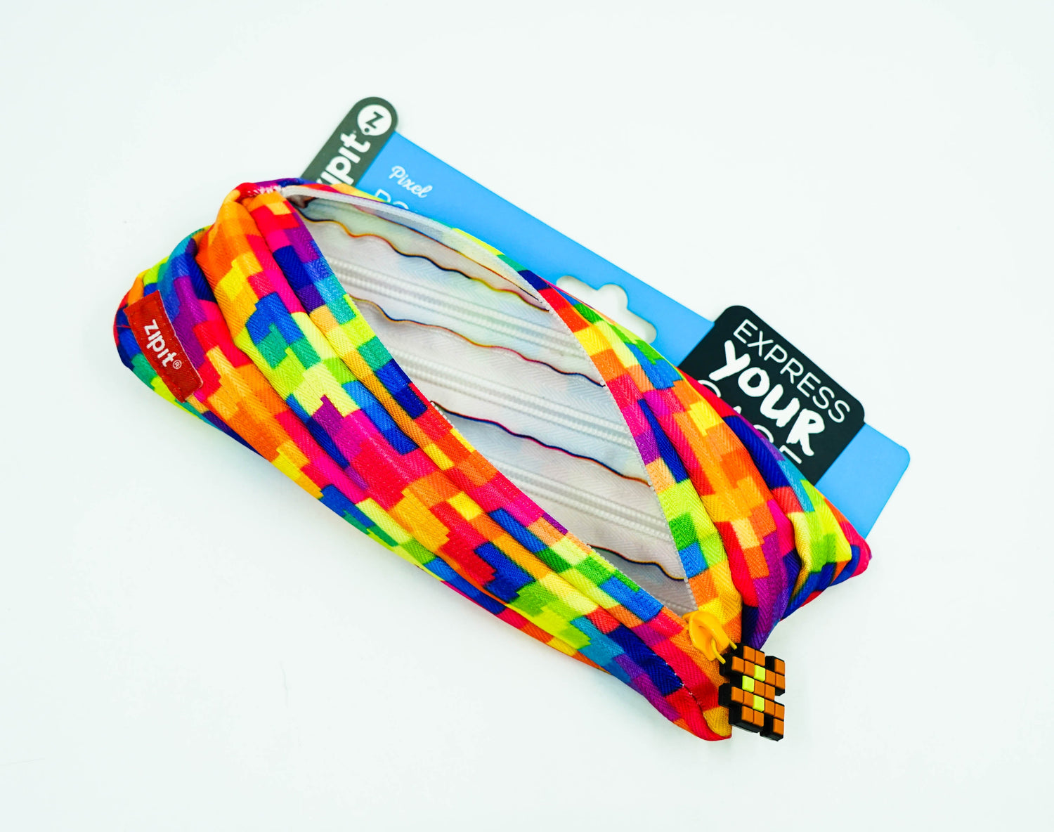 A vibrant pixel-inspired print takes center stage on this fun pouch that is equally at home storing pens and pencils, as it is holding makeup. The innovative design features one long zipper concealed by a special sewing technique. It comes with an extra wide diagonal opening and unique rubber zipper pull. A washable, 100% polyester construction means this pouch is up to any task. You can count on this colorful pouch day in and day out. Use it to hold: Up to 30 pens and pencils Cosmetics and other personal items Cell phone and cell phone accessories Money and more Modern and Versatile This pencil case stands out with its kaleidoscope of colors in a hip, pixelated pattern with matching rubber zipper pull. It’s a fun way to switch up your storage and provides a convenient way to carry a variety of items.
