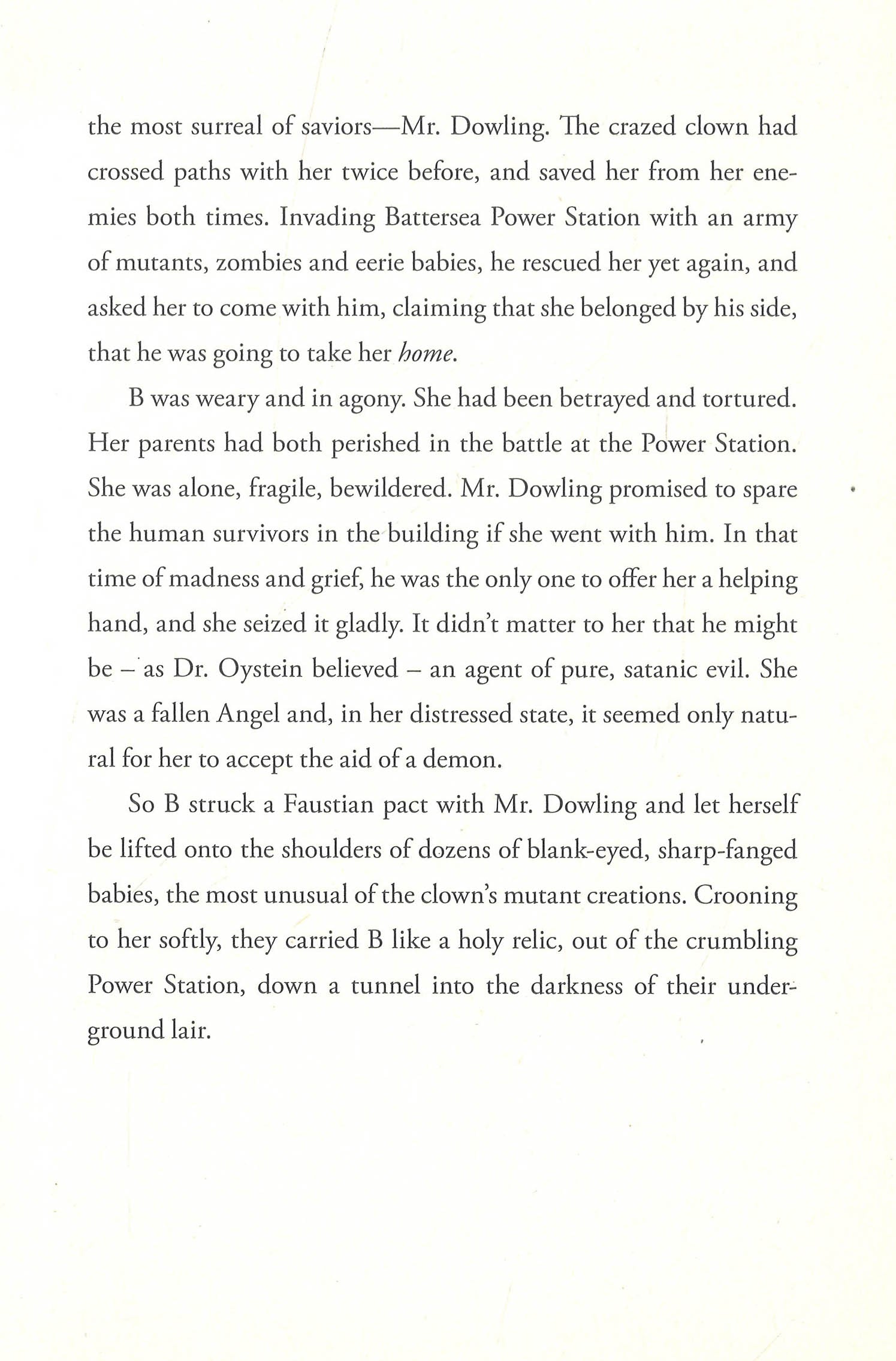 B Smith has been reunited with the murderous maniac clown, Mr. Dowling. To her shock and consternation, he's desperate to make B his partner in crime. Mr. Dowling disgusts her, but B thinks she can see a way to control him and maybe even save the world. But it will involve a sacrifice far greater and more surreal than any she has contemplated before...