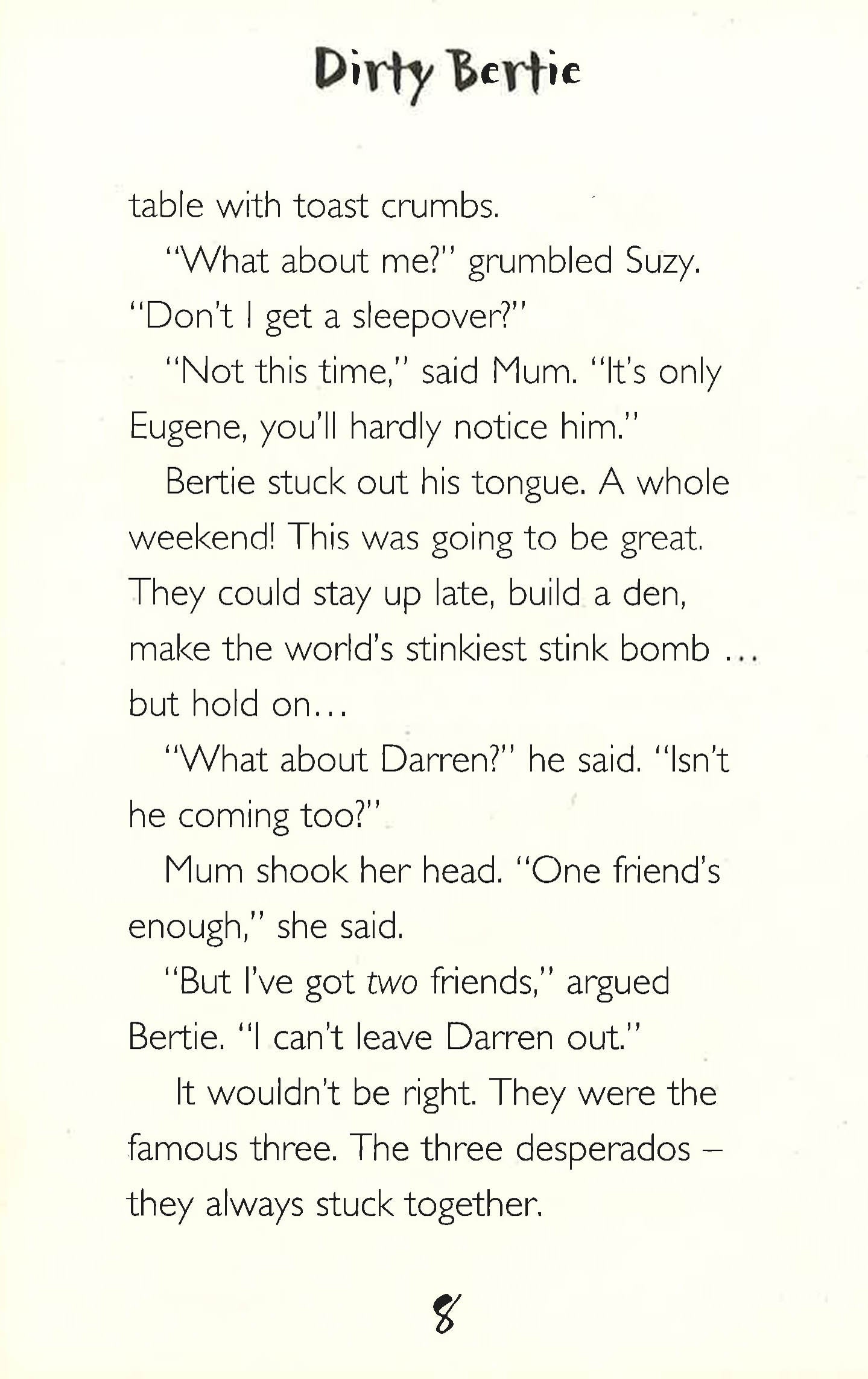 Dirty Bertie is a hugely popular series created by David Roberts. With each hilarious story approximately thirty pages long and split into chapters, Dirty Bertie is ideal for reluctant boy readers or readers in search of hilarity but with a short attention span.