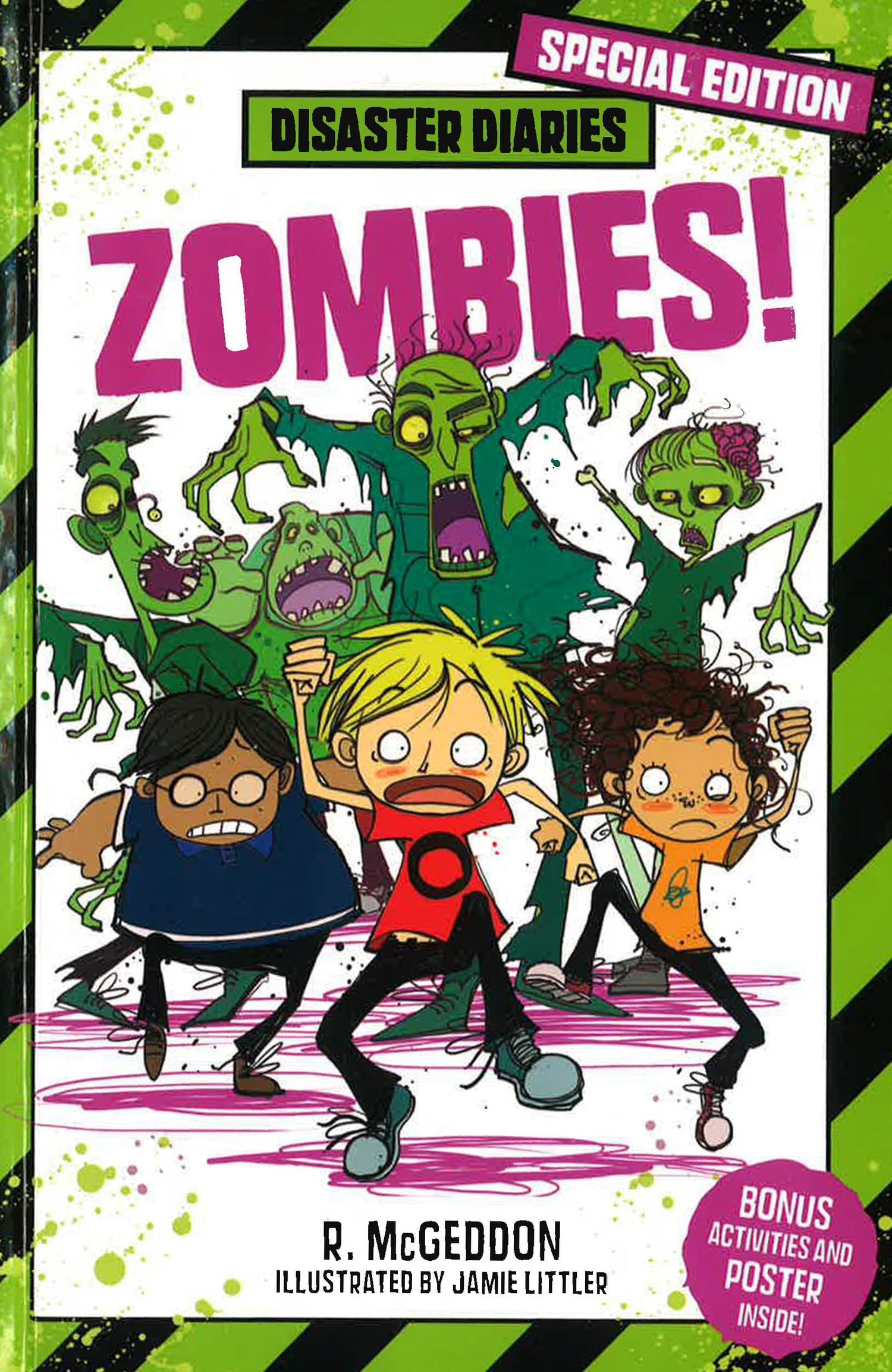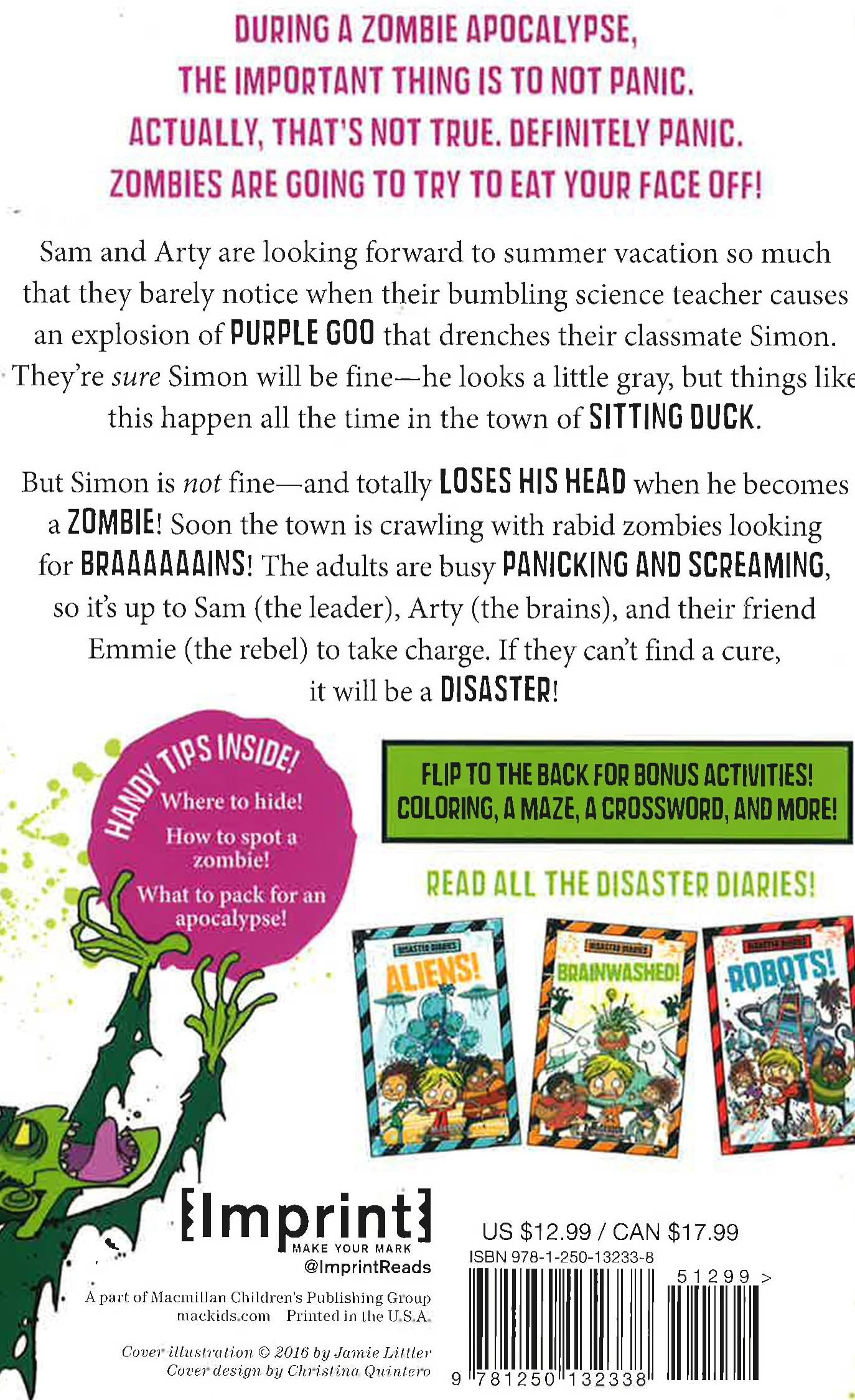 During a zombie apocalypse, the important thing is to not panic. Actually, that's not true. Definitely panic. These things are going to try to eat your face off! Sam and Arty are looking forward to summer vacation so much that they barely notice when their bumbling science teacher causes an explosion of purple goo that drenches their classmate, Simon. They're sure Simon will be fine--he looks a little gray, but things like this happen all the time in the town of Sitting Duck. But Simon is not fine--and totally loses his head when he becomes a zombie! Soon the town is crawling with rabid zombies looking for braaaaaains! The adults are busy panicking and screaming, so it's up to Sam (the leader) Arty (the brains), and their friend Emmie (the rebel) to take charge. If they can't find a cure, it will be a disaster! Disaster Diaries: Zombies! is perfect for young readers, reluctant or otherwise, with a wacky sense of humor. The first in this hilarious middle grade series from author R. McGeddon will prepare you for your own zombie infestation, with handy tips like how to spot zombies. (Hint: their faces are falling off). An Imprint Book
