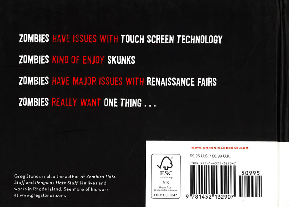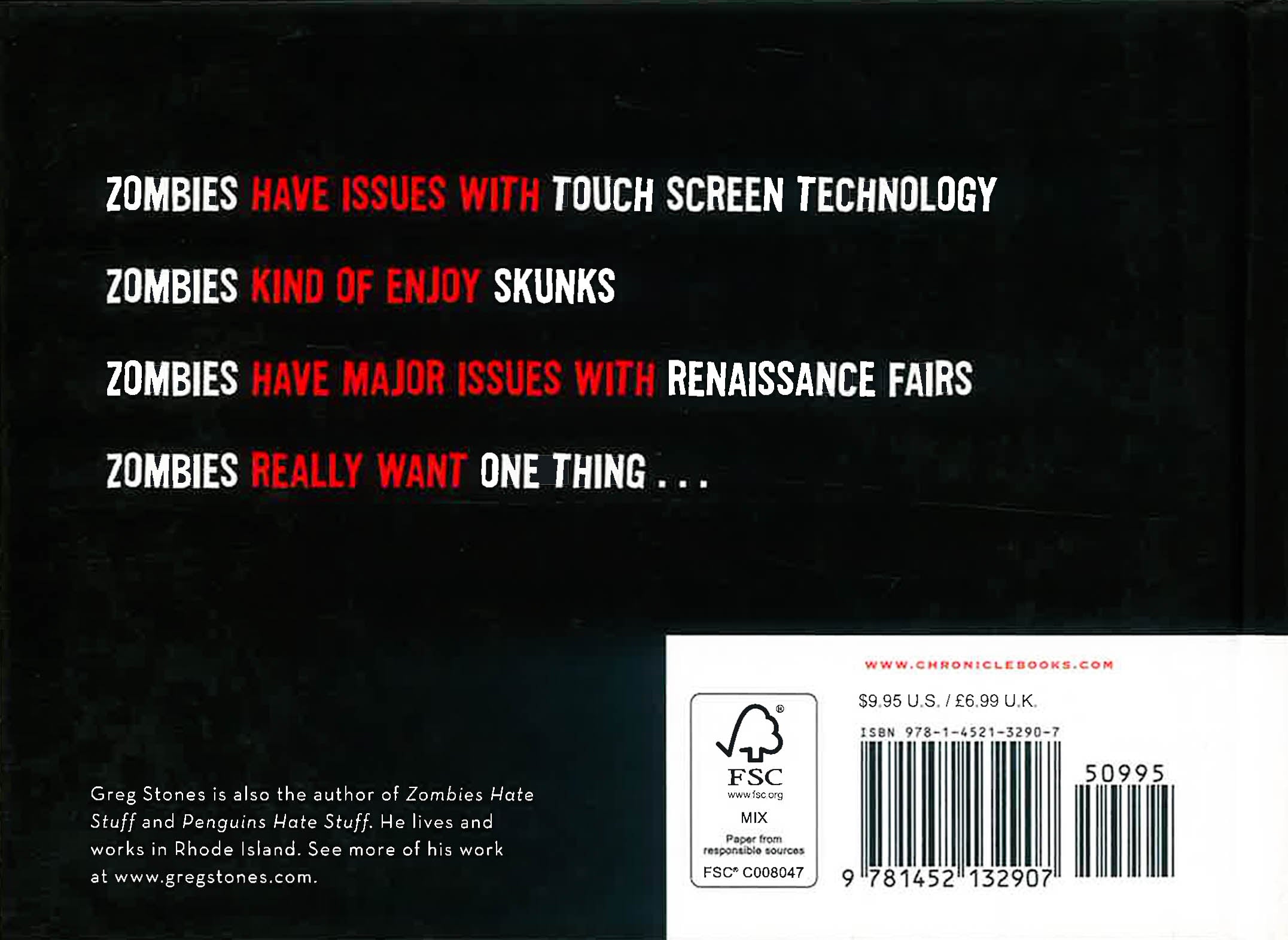 As we know from Greg Stones's first breakout hit book, zombies hate stuff. It's less understood that the undead also struggle with the stuff of everyday life usually navigated by the breathing. Zombies have issues with yoga, bad hair days, chopsticks, the morning commute, touch-screen technology, and more. They kind of enjoy skunks, gardening, and acupuncture, but they have major issues with banana peels, Renaissance fairs, bear traps, and bunnies. In the face of such adversity, all zombies really want is a cure. With humor, wit, and braaaains, Greg Stones's colorful painted panels offer a sympathetically funny, new perspective into the trials and tribulations of the undead in a world made for the living.