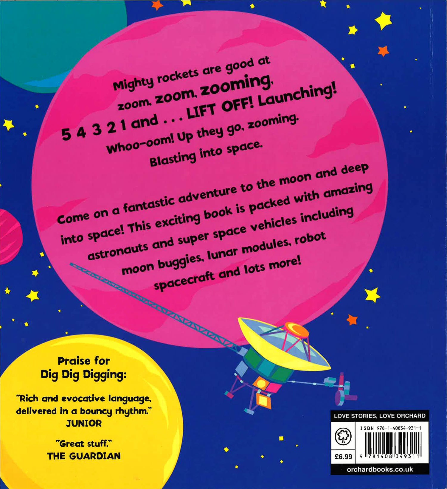 A mighty machine-filled fun read for brilliant boys! Come on a fantastic adventure to the moon and deep into space! This exciting story is full of amazing astronauts and super space vehicles, including moon buggies, lunar modules, robot spacecraft and lots more! With bright, bold artwork, fun rhyming text and lots of sound words to read aloud, this is perfect for sharing with machine-mad boys.