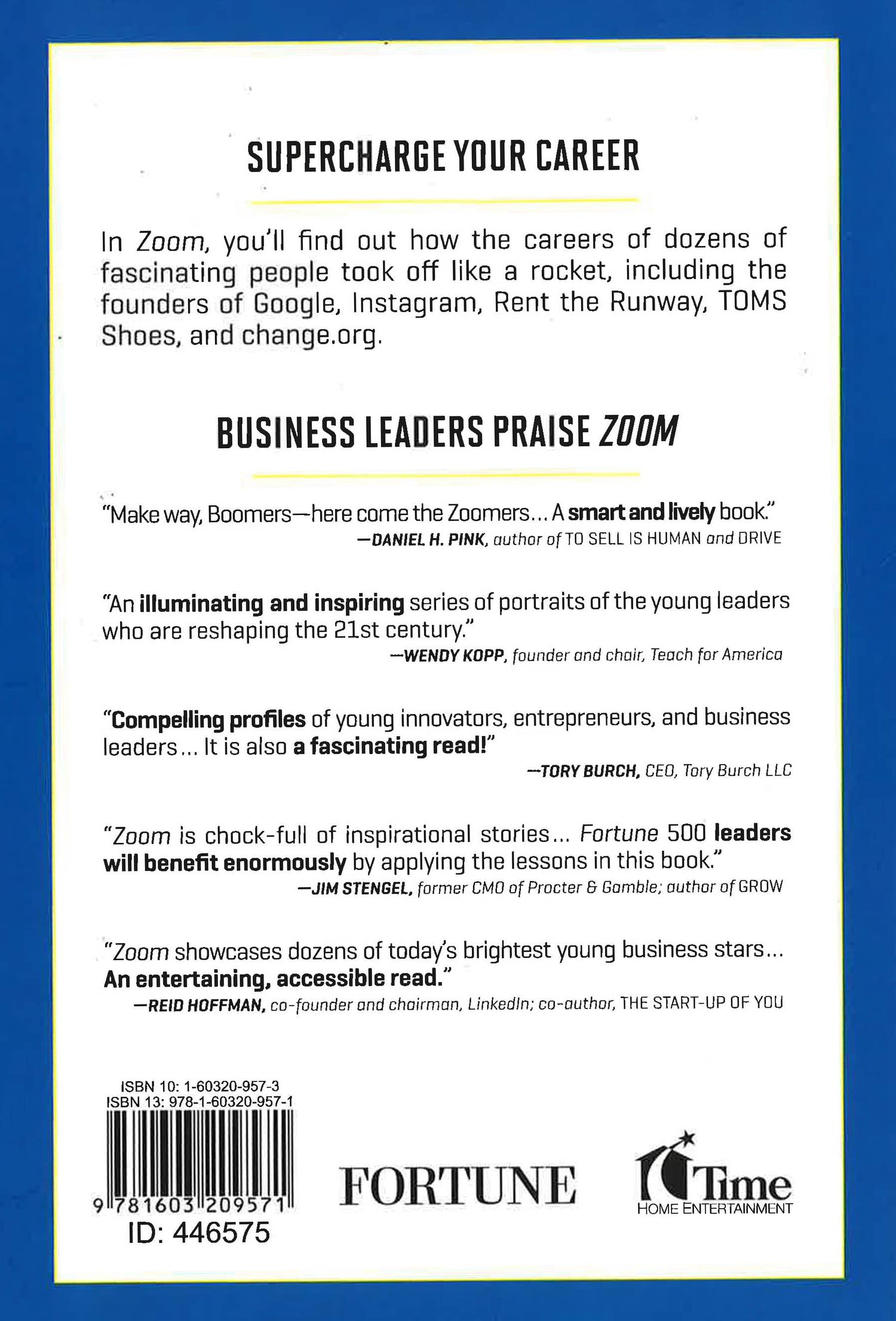 With "Zoom!," "Fortune" magazine extends one of its most successful franchises, "40 Under 40," to bring you the best kept secrets from top entrepreneurs, business leaders and rising tech stars. Discover how Mark Zuckerburg and Jack Dorsey revitalized social media, how Karl-Johan Persson turned a troubled retailer into a billion dollar fashion chain and why Ryan Seacrest is redefining the term "media mogul." "Zoomers" features the fascinating profiles of these and other young innovators and provides readers with tips to fast track their own career success.