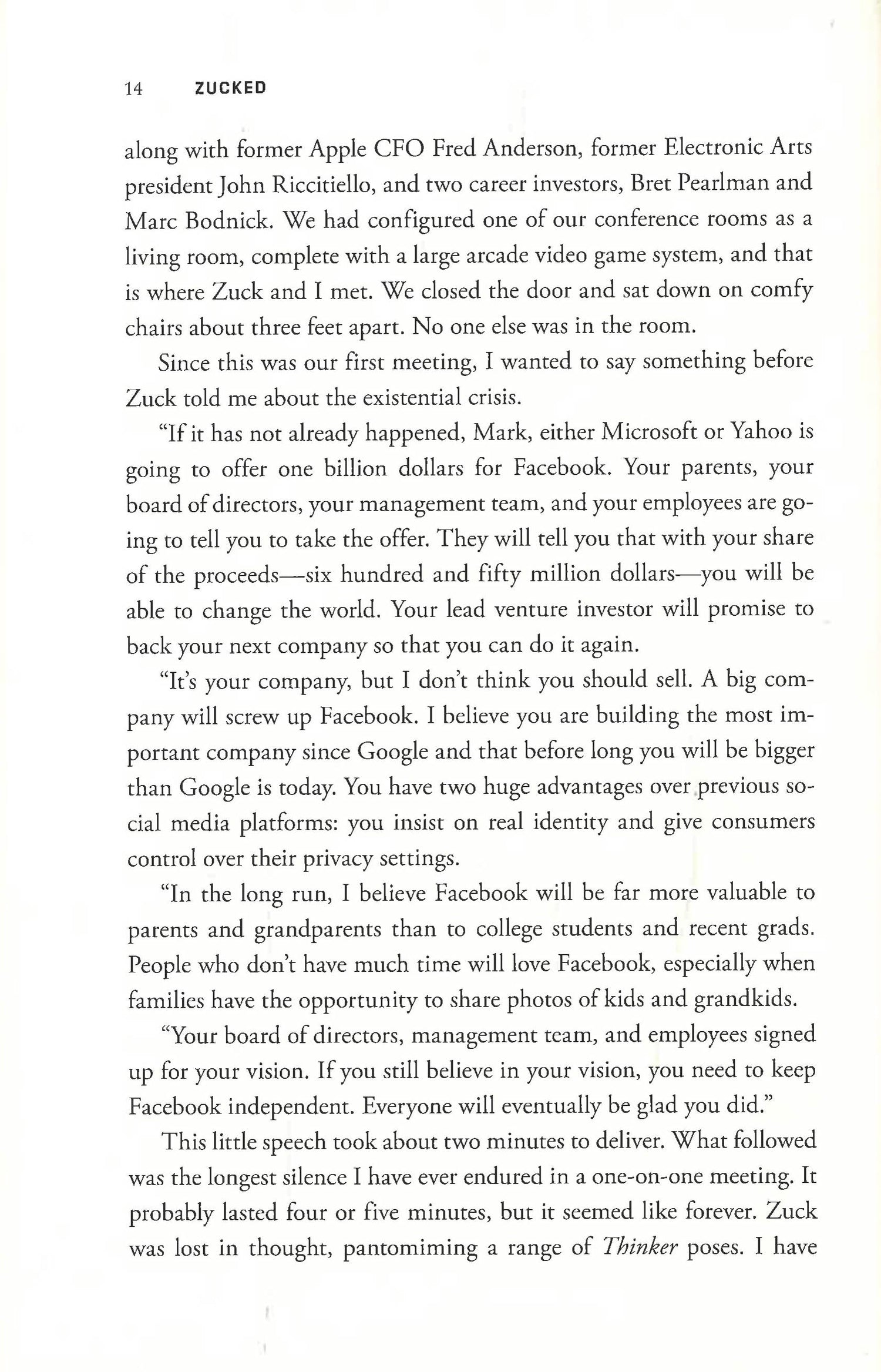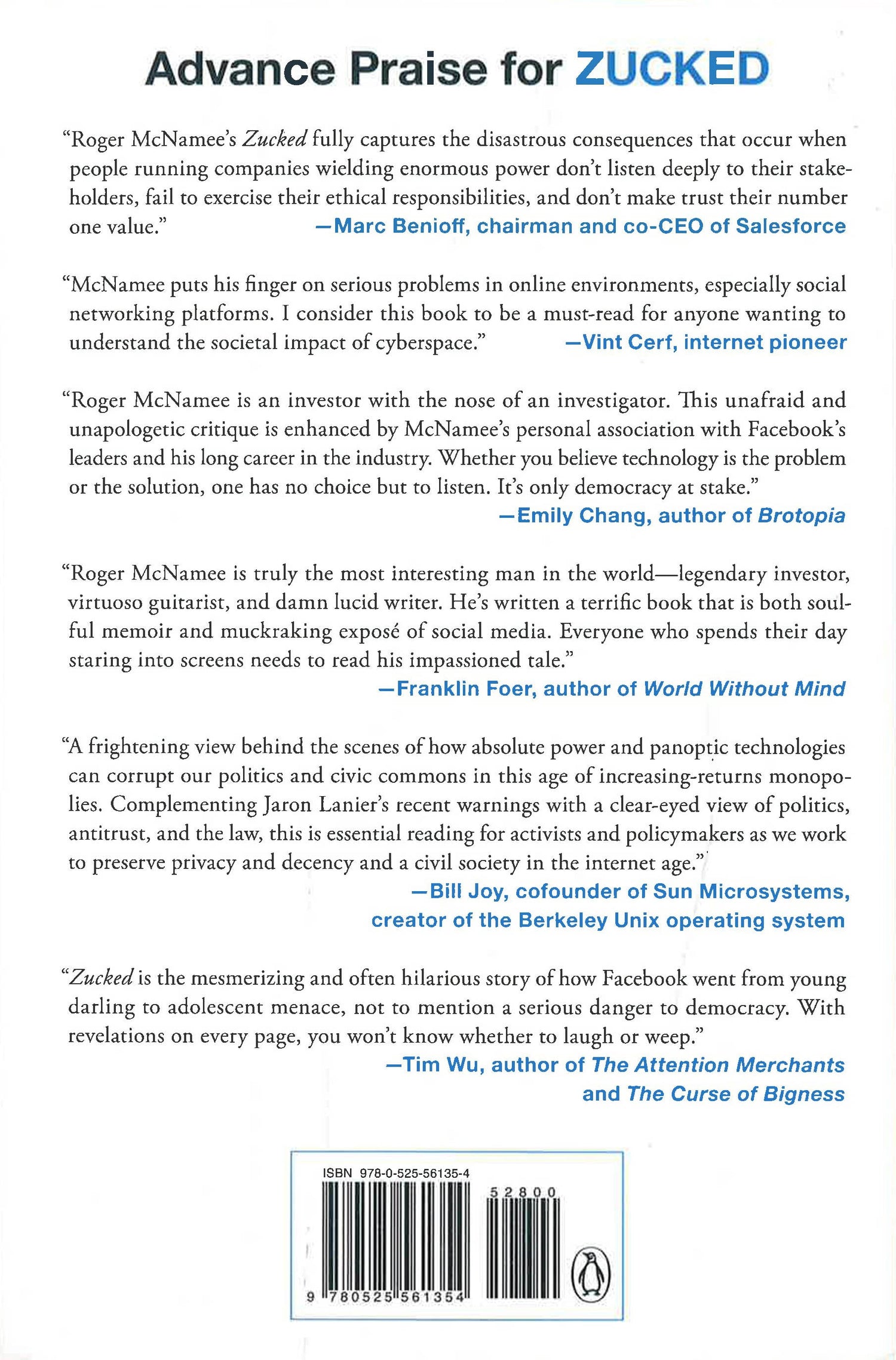 The New York Times bestseller about a noted tech venture capitalist, early mentor to Mark Zuckerberg, and Facebook investor, who wakes up to the serious damage Facebook is doing to our society - and sets out to try to stop it. If you had told Roger McNamee even three years ago that he would soon be devoting himself to stopping Facebook from destroying our democracy, he would have howled with laughter. He had mentored many tech leaders in his illustrious career as an investor, but few things had made him prouder, or been better for his fund's bottom line, than his early service to Mark Zuckerberg. Still a large shareholder in Facebook, he had every good reason to stay on the bright side. Until he simply couldn't. ZUCKED is McNamee's intimate reckoning with the catastrophic failure of the head of one of the world's most powerful companies to face up to the damage he is doing. It's a story that begins with a series of rude awakenings. First there is the author's dawning realization that the platform is being manipulated by some very bad actors. Then there is the even more unsettling realization that Zuckerberg and Sheryl Sandberg are unable or unwilling to share his concerns, polite as they may be to his face. And then comes the election of Donald Trump, and the emergence of one horrific piece of news after another about the malign ends to which the Facebook platform has been put. To McNamee's shock, even still Facebook's leaders duck and dissemble, viewing the matter as a public relations problem. Now thoroughly alienated, McNamee digs into the issue, and fortuitously meets up with some fellow travelers who share his concern, and help him sharpen its focus. Soon he and a dream team of Silicon Valley technologists are charging into the fray, to raise consciousness about the existential threat of Facebook, and the persuasion architecture of the attention economy more broadly -- to our public health and to our political order. Zucked is both an enthralling personal narrative and a masterful explication of the forces that have conspired to place us all on the horns of this dilemma. This is the story of a company and its leadership, but it's also a larger tale of a business sector unmoored from normal constraints, just at a moment of political and cultural crisis, the worst possible time to be given new tools for summoning the darker angels of our nature and whipping them into a frenzy. Like Jimmy Stewart in Rear Window, Roger McNamee happened to be in the right place to witness a crime, and it took him some time to make sense of what he was seeing and what we ought to do about it. The result of that effort is a wise, hard-hitting, and urgently necessary account that crystallizes the issue definitively for the rest of us.